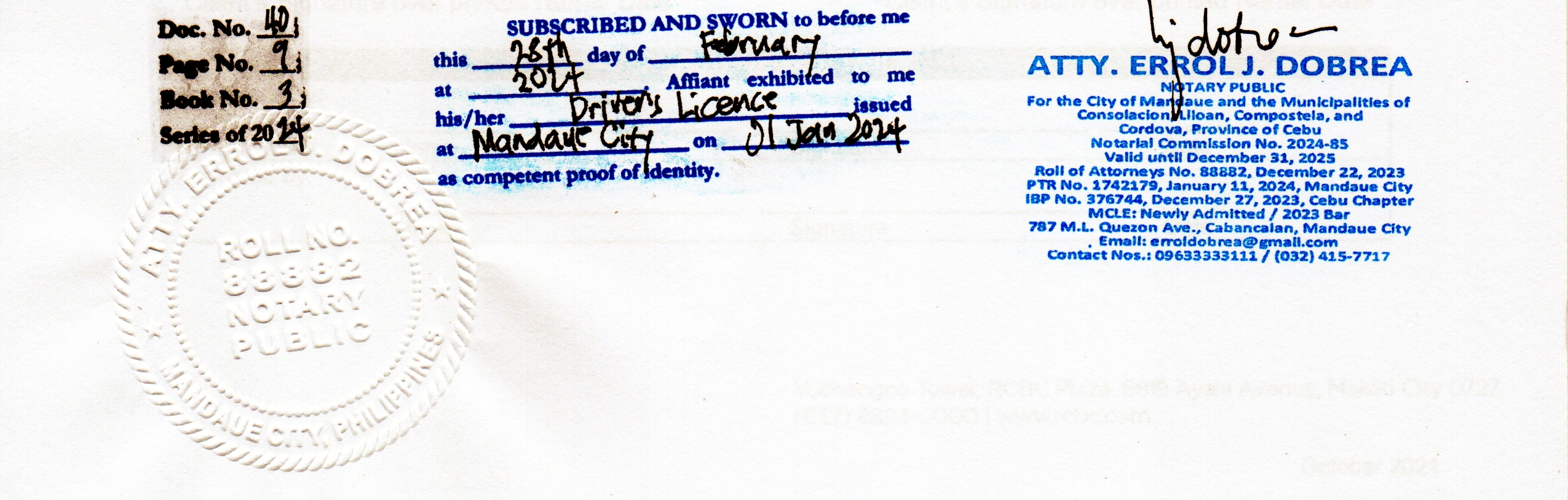 Atty. Errol J. Dobrea is a notary public commissioned under the territorial jurisdiction of the City of Mandaue and the Municipalities of Consolacion, Liloan, Compostela, and Cordova. If you require notarial services, please feel free to contact me.